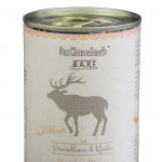 Ingredientes: 77% de animales de caza* (corazón, carne, hígado), 6% manzana, 5% arándano, 5% calabaza, 5% patata, 1% minerales, 0,5% aceite de hígado de bacalao, 0,5% aceite de germen de trigo.