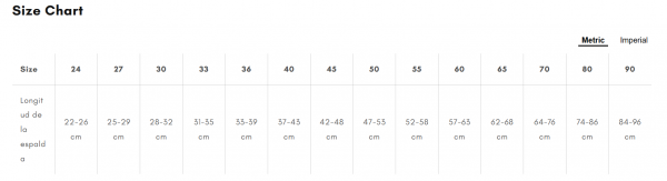 Está disponible en varios colores y tallas (desde 24 hasta 90 cm de cruz de espalda), adaptándose a perros de diferentes morfologías y tamaños.